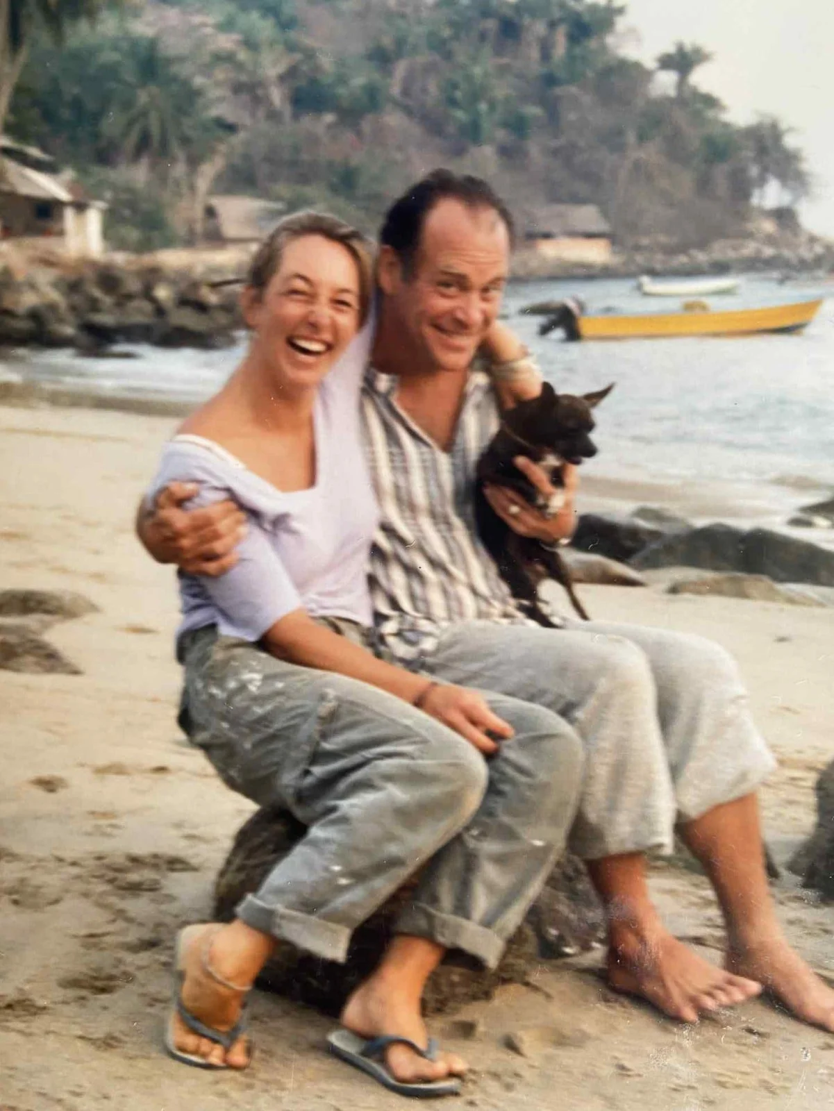 Nall, Claudia Lake, and one of his beloved Chihuahuas on a beach in Yelapa, Mexico (Photo courtesy of Claudia Lake)
